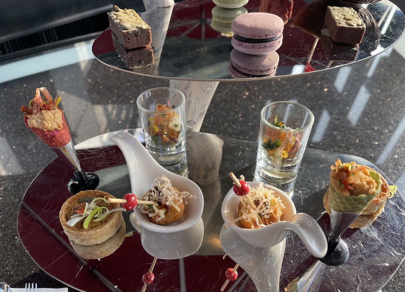 風景超好的下午茶 🤗 吃的時候正值下午時段(阿就下午茶),太陽好大,但是為了看漂亮的風景也只能忍耐一下,不過完全不會熱,雖然是室外但椅子下面有冷氣。防曬有擦就沒什麼問題了😘座位超級大,兩個人在那邊跑來跑去拍照,那個樹真的是非常浮誇 疫情關係不能分食所以服務生會幫忙分到各自的盤子上食用,但他都沒按照順序,害我一個完全搞不清楚哪個先吃。只能看看照片回顧。 ————————— 天空樹點心部分 我覺得英式最棒的就是甜鹹交替 11樣點心,其中七個甜的,四個鹹的。(他似乎多送了一個?)