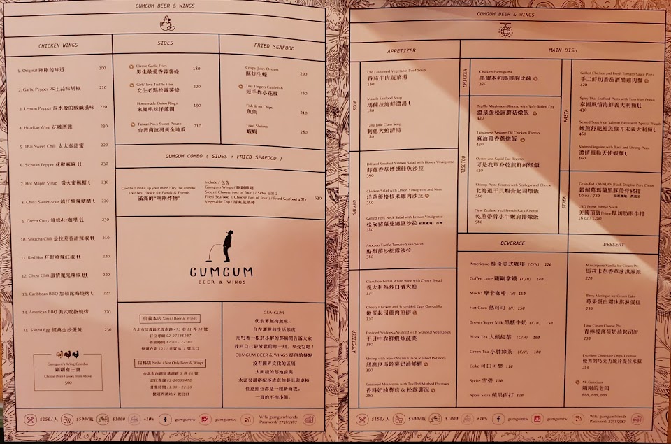推推推推!剛好在信義區附近想找個地方喝啤酒,看到GumGum的logo很討喜就來了,完全喜歡上這裡,大片落地窗可以看到對面公園和小區街道,空間很寬敞,客人間完全不會互相影響。雞翅是招牌,我們點了微火蜜楓糖口味,不太辣但醬很搭,如果能附一些芹或蔬菜棒會更加分甚至更開胃繼續點更多❤️啤酒種類很多茶類水果類bottle或on tap都有,蒜香薯條比預期還大盤,看得出是用大顆馬鈴薯,份量很足配蜂蜜芥末醬很讚,吃得心滿意足,度過非常舒服的晚上。室內擺飾也很用心,大座椅、一致性的掛畫、小茶几,到廁所裡令人會心一笑的黑熊掛勾都可以看出店家設計的用心,讓人一定會再訪的店,想再試試其他餐點和料理。