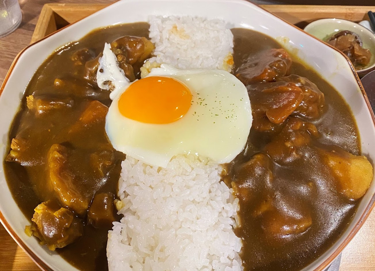 5月多在Uber Eats上訂購的 咖喱蠻濃郁的 搭上半熟蛋和起司非常美味 炸豬排也蠻酥脆的 雖然價格稍高還尚可接受 不過吃到一半的時候吃到鐵絲⋯⋯⋯⋯以後應該不會再回購了? …