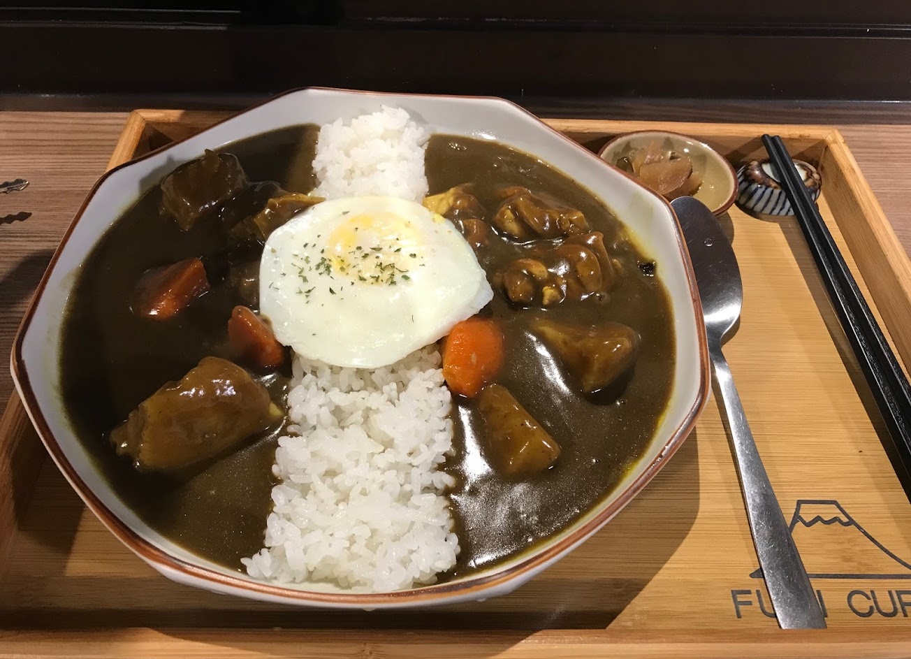 1. 外帶價格比內用便宜60元,內用有附一個荷包蛋,外帶則需要另外單點 2. 馬鈴薯、胡蘿蔔跟肉類都是跟咖哩醬分開的,上桌前在盤子上放上配料後再淋上醬汁,由於蔬菜都切得很大塊,這樣的做法讓馬鈴薯胡蘿蔔雖然避免完全軟爛的口感,但內部根本沒味道 3. 牛肉煮得柔軟(只吃了一小口印象不深),雞肉雖然是雞腿肉但吃起來偏柴,豬排雖然看起來很厚,但吃了才發現是裹了很厚的麵衣,肉本身大概只有一半不到的厚度 4. 咖哩醬濃郁也不會太鹹,白飯也煮得很不錯,配上桌上擺的辣油好吃 5. 吃完以後看到評論才發現飯後有檸檬片,但我們沒吃到耶…(;ω;) 完全沒被告知這件事情