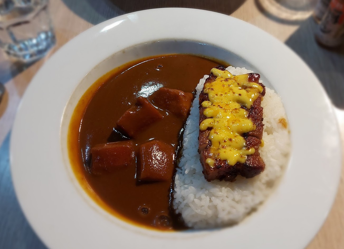 很不錯的一家咖哩。豬肉有點像港式燒臘的那種帶甜味,上面加了一點起司增加味覺的豐富。咖哩本身是溫和的口感微微辛辣,是個推薦的咖哩餐廳。