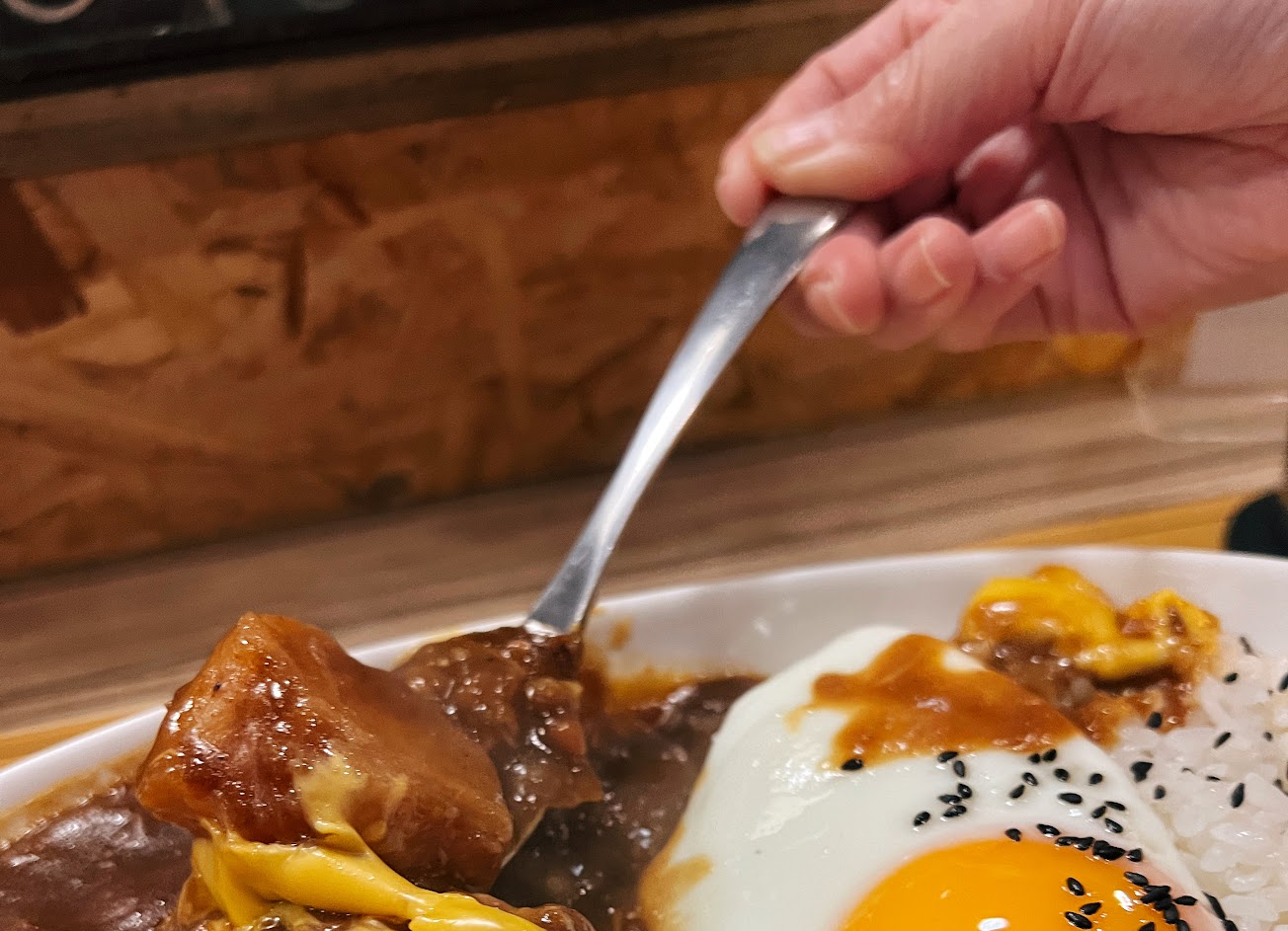 聽在地人推薦,今天來朝聖,店內裝潢很潮,音樂很像夜店(超愛)咖喱牛肉超滑嫩的啦,入口即化,炙燒肉醬咖喱超好吃?廚師都很有型感覺是下班會去溜滑板的那種,飯粒口感粒粒分明超彈牙,味增湯好好吃有蛋耶,咖喱吃完還可以續?香腸跟那荷包蛋,omg真的歐伊西啦,大家不要來啦!不然又要排隊了啦?