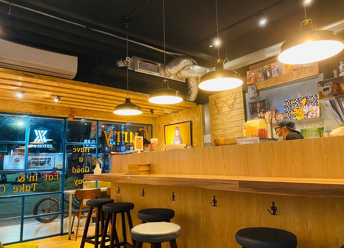 休閒的木造餐廳,供應日式牛肉、雞肉和豬肉咖哩料理,還有湯品。