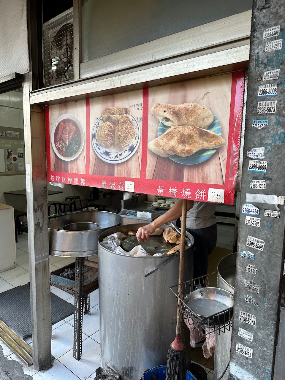 [特色]張吳記麵餅舖中有被分成兩部分,分別是炭燒燒餅與麵店,右方為燒餅舖,也是這次消費的部分。燒餅有分成兩種類型,蟹殼黃和黃橋燒餅。蟹殼黃有分鹹甜,鹹的部分以蔥花為主,無肉,甜蟹殼黃則是芝麻內餡而非常見的糖膏系統,不管鹹甜,這家蟹殼黃主要著重在他的麵皮層次,層層疊疊與芝麻香氣,餡料部分是作為點睛之筆。黃橋燒餅是蔥花燒餅,相當適合買回家復烤當早餐。燒餅在圓柱形的烤爐裡黏貼後,再由木炭在底部烘烤,所以將燒餅取出時需要忍受高溫,相當辛苦。