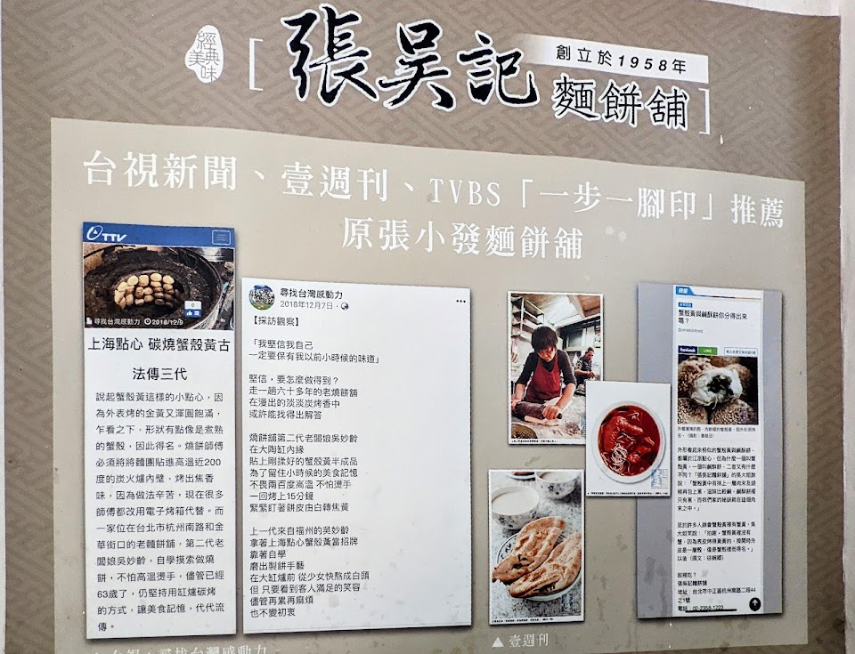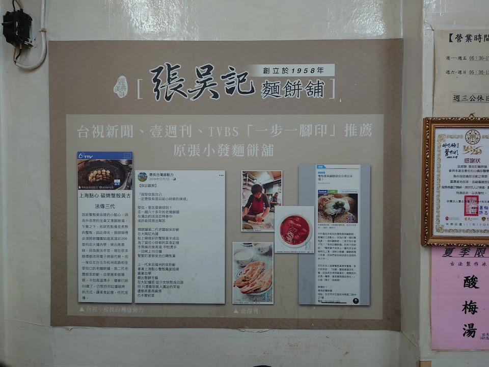 原名“張小發麵餅舖”,最早是在現今“天然臺”餐廳旁的寧波東街上支起棚架做營生(其實就是當年低矮木板房的違建),以燒餅、蟹殼黃為主力商品;搬遷至現址金華街杭州南路口也更名為“張吳記”麵餅舖,原來的店名也以小字註記在店外的招牌上。