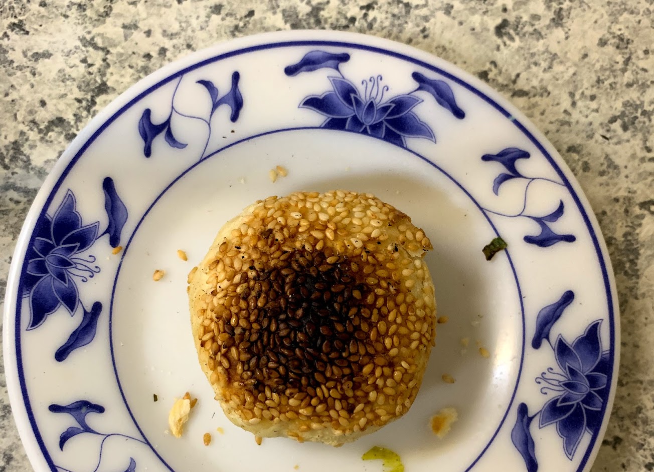 早上剛過來買燒餅,馬上回家享用。但燒餅又硬又乾,吃的有點辛苦。 也吃不到麵香和蔥味。