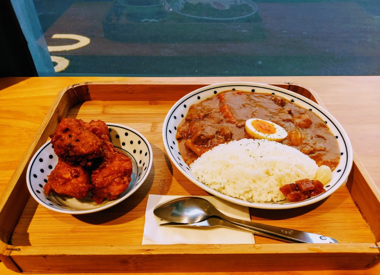 3、內用只有九個座位,建議外帶比較方便,而且便宜40元。咖哩不錯,甜、辣、酸三種口味混合,配上福神漬、醃薤與糖心蛋很搭,特別推薦單點炸雞,肉嫩且Juicy,非常好吃,認識店家的朋友說,廚師之前曾在串燒店工作過一陣子,難怪炸雞特別好吃。