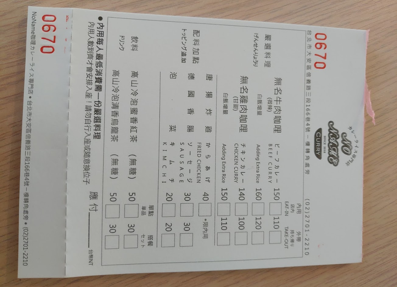 1、地址在大安區信義路三段166巷4-1號,捷運大安站步行約兩分鐘,大安高工後門的對面。 2、只賣兩種咖哩:無名牛肉咖哩與無名雞肉咖哩,價格150元/140元。如果選擇內用的話,還可以單點炸雞與德國香腸。 3、內用只有九個座位,建議外帶比較方便,而且便宜40元。咖哩不錯,甜、辣、酸三種口味混合,配上福神漬、醃薤與糖心蛋很搭,特別推薦單點炸雞,肉嫩且Juicy,非常好吃,認識店家的朋友說,廚師之前曾在串燒店工作過一陣子,難怪炸雞特別好吃。