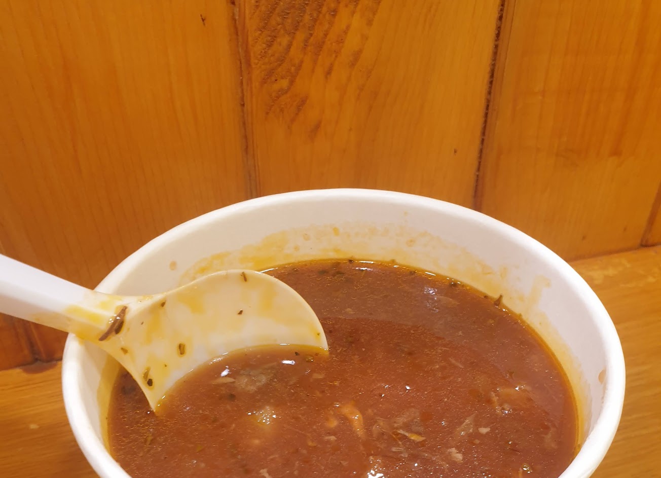 咖哩跟肉高湯混在一起吃很香!而且不會覺得油膩。但如果內用有非一次性的餐具就更好了