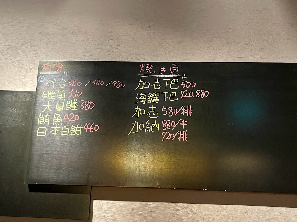 好吃的烤魚,玉子燒,生魚片,黑板上的小菜。