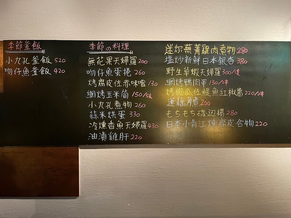 綜合生魚片 山葵酒粕起司豆腐 炸干貝 味噌雞肉釜飯 蛤蜊味增湯 fu a fu a 蛋捲 秘傳雞翅 網烤煙燻松阪豬 牛蒡 照燒雞肉&天婦羅