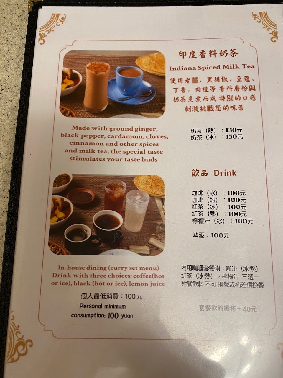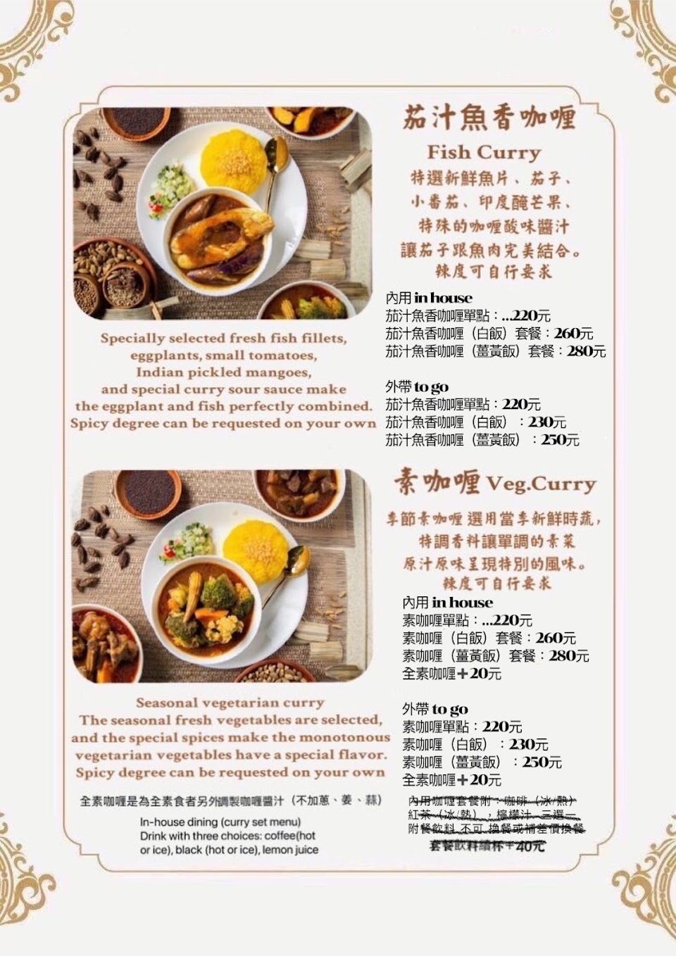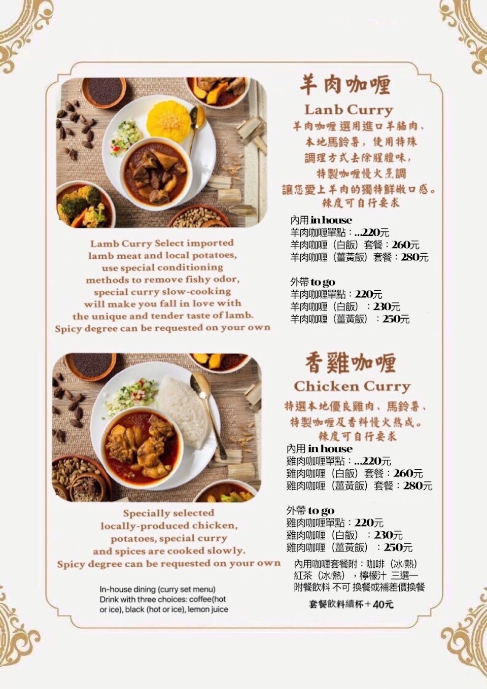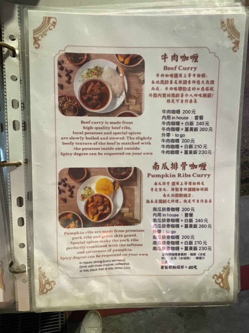 2023.10.18今天二度來訪,老闆很熱情,國語台語英語都通,會跟客人閒聊,咖哩一樣好吃,更棒的是現在多了飲料無限暢飲,有冰奶茶、冰檸檬汁、冰水??對了!順帶一提,這邊只收現金哦