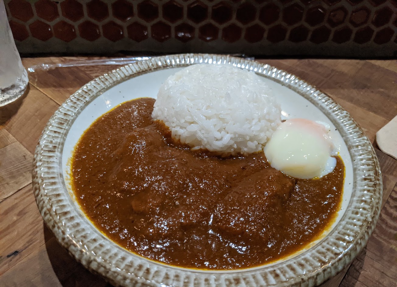 甘口的日式咖喱小店,海報很有日式明治維新時期洋化感,吧台座位不多大概8個沒有收服務費,不確定樓上能不能坐,每人必須點一份咖喱,也可以另外點小菜、炸物跟飲料。這次點牛叻條+豬肉綜合咖喱,有了半熟蛋更有滑順感。