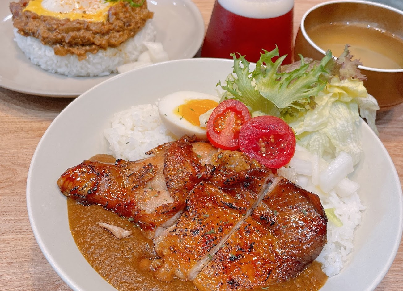 半熟蛋加上微辣的乾咖哩,相當美味有層次,雞腿咖哩醬味道較甜,兩種都好吃? …