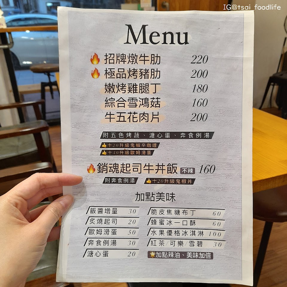 豬肋條咖哩換溫泉蛋 160 牛肋條咖哩換溫泉蛋 170 今天噴槍沒瓦斯所以沒能加炙燒起司 檸檬感覺泡太久 水有點太酸 店內位子不多 大約只能容納10人 咖哩為香料主體帶點辣 加奶油 豬肋條口感較牛肋條好 份量有點不足 但十分推薦