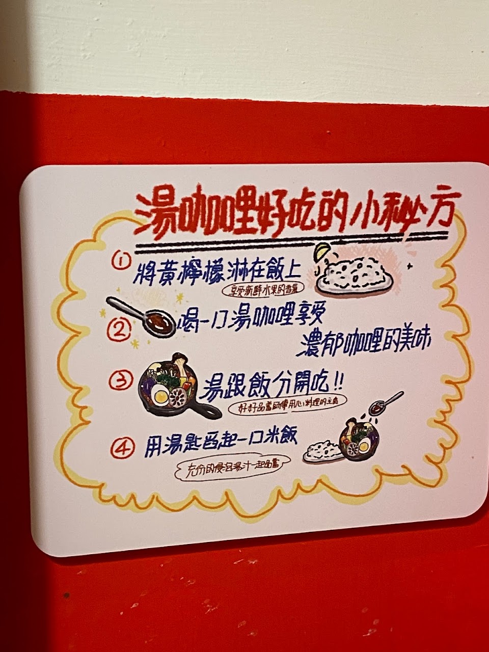 在快要打烊的午後來用餐,店面不大一次最多6個人用餐,第一次吃湯咖哩,覺得份量很足,起司飯和檸檬汁的搭配很驚艷,蔬菜很好吃,不會被咖哩味覆蓋,吃得出蔬菜的原味,店家還有招待可爾必思,會再來訪*^O^*