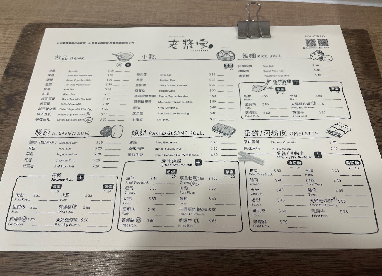 在忠孝東路與延吉街口 在延吉街110號 有家乾淨明亮的 燒餅店—老漿家 有點像咖啡店的裝潢 賣的多元化的產品