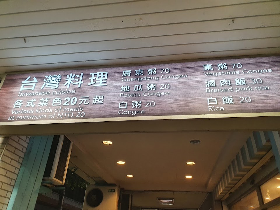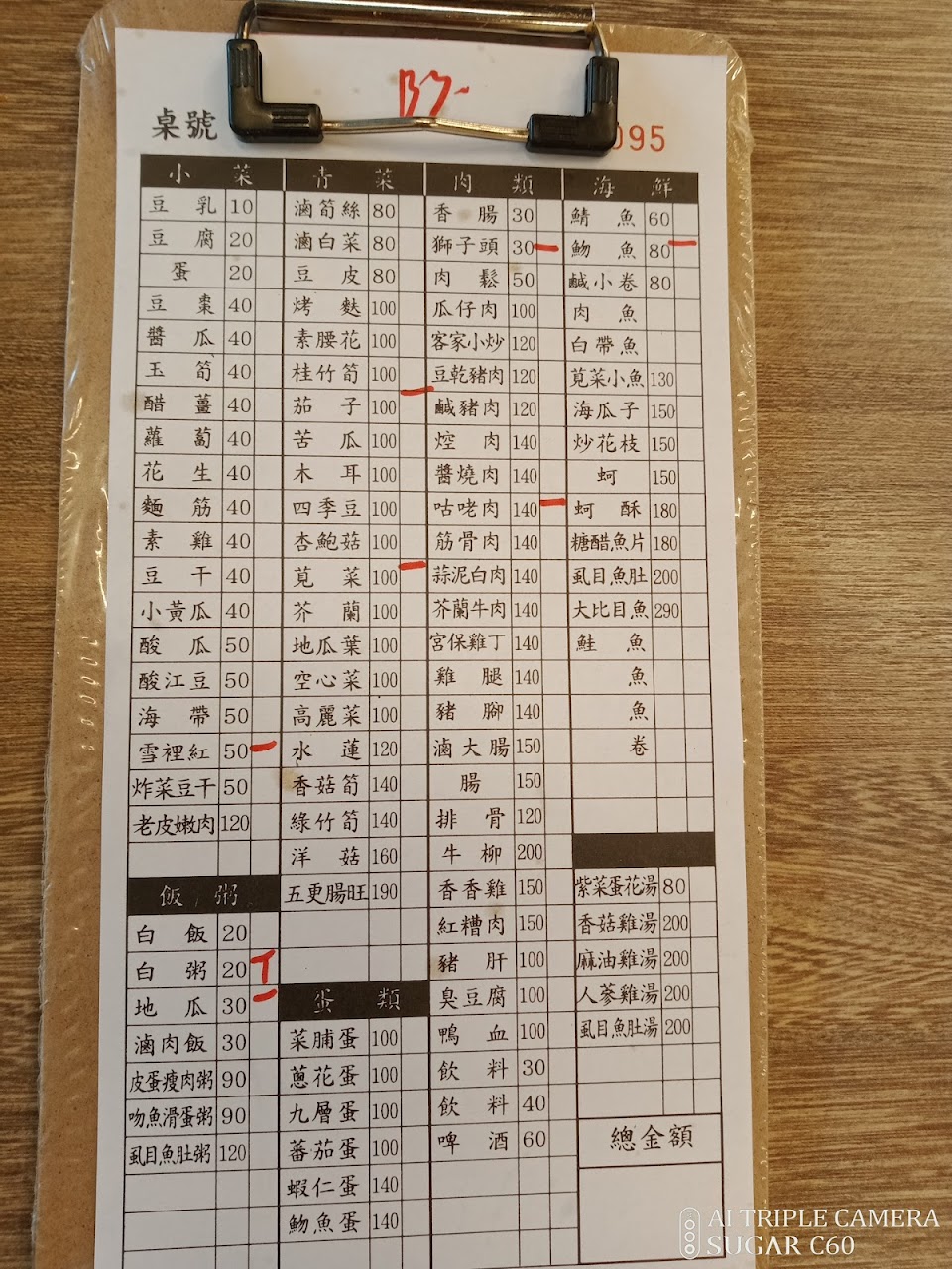 一人用餐可以點小份。桂竹筍60,骨頭肉90,辣味腐乳10,白粥20,白粥可以免費續。桂竹筍和骨頭肉上桌之後會繼續加熱一段時間。桂竹筍的鮮味和辣油調味不錯,也沒有竹筍的酸味。骨頭肉稍微有點酸。腐乳比較甜。一人份價格和附近小李子差不多,但是服務更好一些,加了多次粥也毫無慍色。