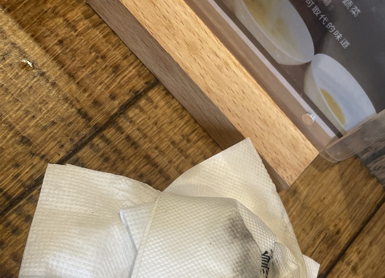 坐下發現桌上有攤液體,本想只是店員可能拿水時,不小心潑倒在桌上,順手拿張衛生紙擦乾,沒想到衛生紙上面黃黃黑黑,趕忙再擦第二次、第三次,直到第四次才覺得心裡稍微舒服一點,用餐過程不斷提醒自己手不能碰到桌上。