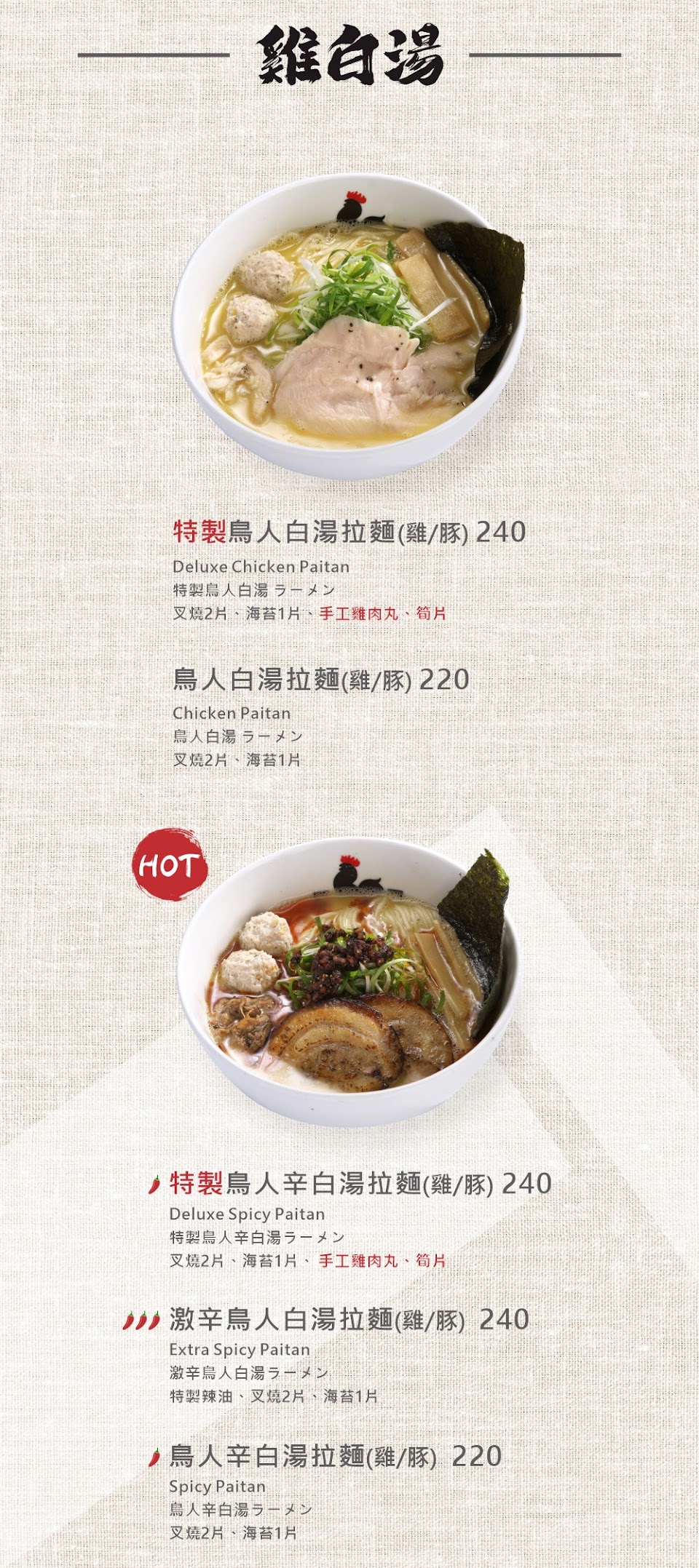 特製鳥人辛白湯拉麵(雞) 240元