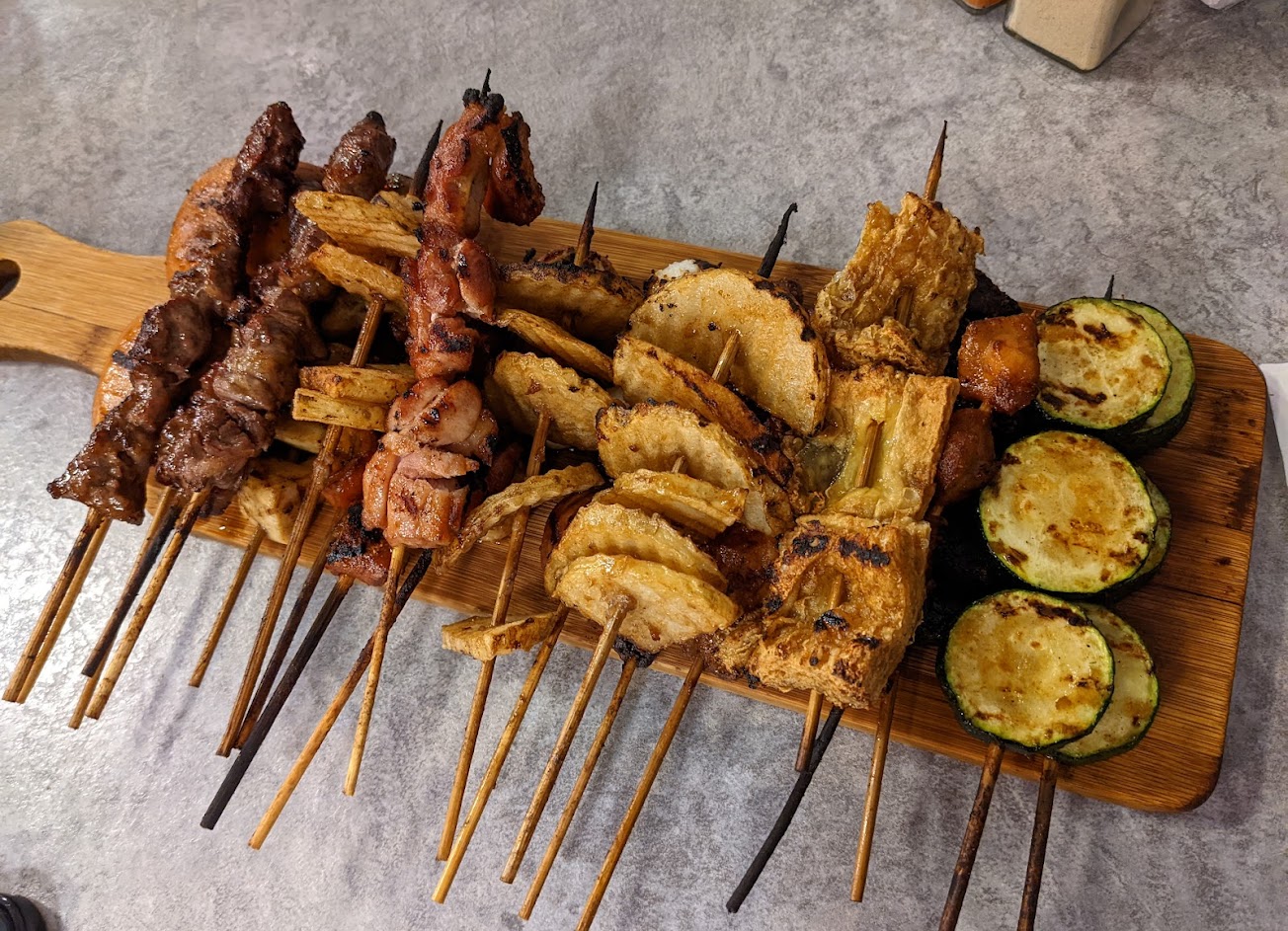 串燒好吃!調味合宜,尤其杏鮑菇超級多汁! 結帳完會告訴你坐哪桌,平日位置大概六點半左右就坐滿了,上餐大概等了半個小時,位置滿小的,東西很多的話建議寄放在捷運置物櫃。 服務 內用 餐點類型 晚餐 平均每人消費金額 $200-400
