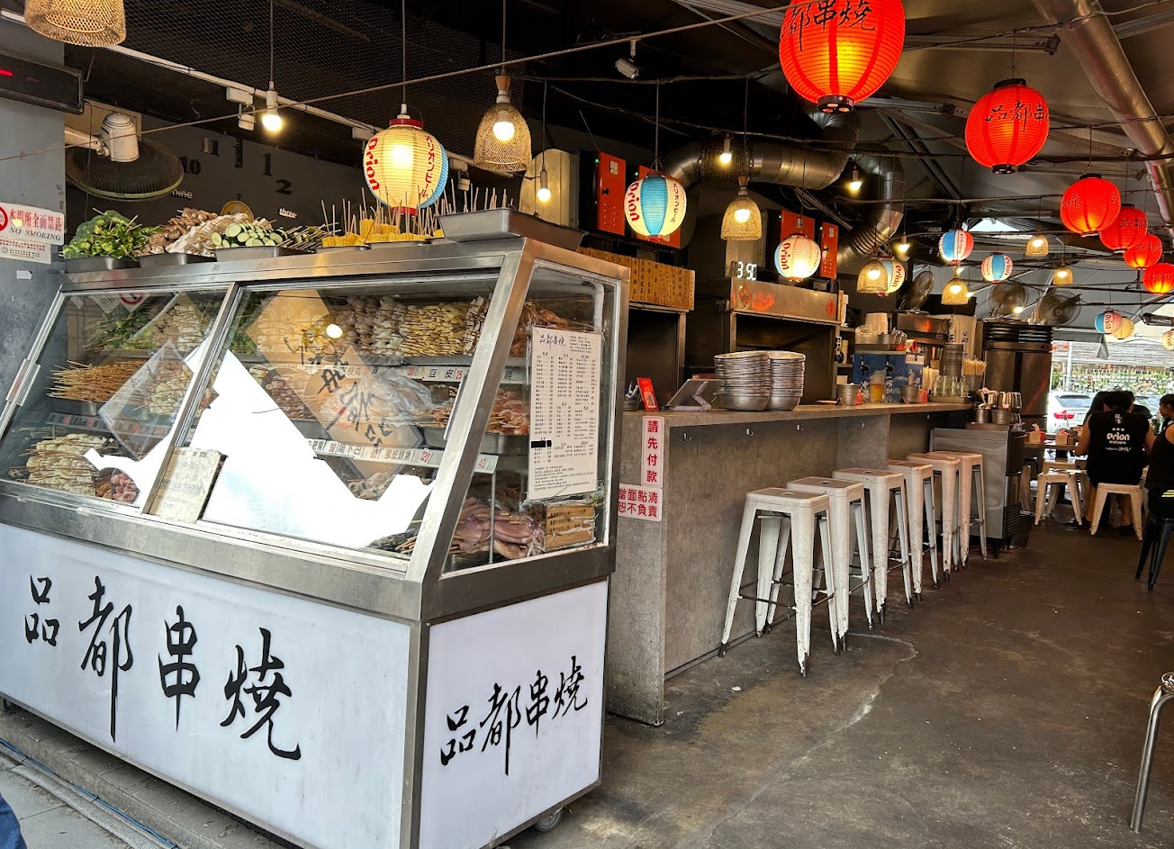 不知道要吃啥但有想跟朋友吃串燒喝點小酒,首選就是品都 雖然用餐尖峰時間要排隊,但可以先掃qr code線上排隊,等時間到了再回去~~ 食材櫥窗不大,大概佔兩三個人就滿了,若人多的話就需要按照順序,品項蠻多樣化的;其中又以馬鈴薯、豆皮、肥腸我最喜歡.調味偏重,可以再撒上桌面的胡椒跟辣椒,重口味的一定要來試試!價位對於台北串燒店來說相對親民.非常適合下班後三五好友相聚小酌1234杯~還有冰塊可以自取很方便. 服務 內用 餐點類型 晚餐 平均每人消費金額 $200-400 建議的餐點 綜合串燒 記得加小綠粉 豆干 玉米 豬血糕