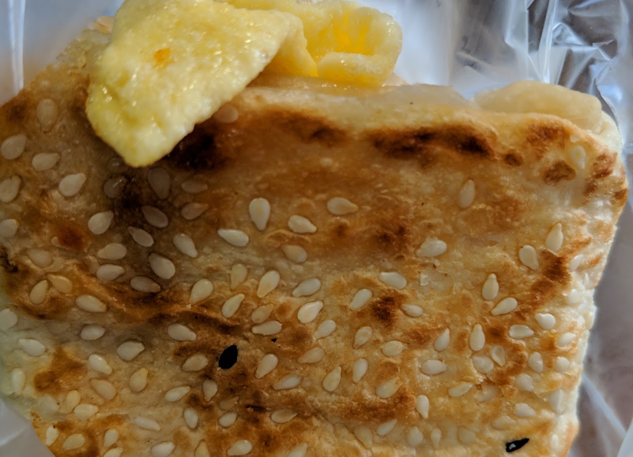 淡薄清風中透出阵阵微温,张口一来,驚豔于酥脆尤带 Q弹靱性,沾满芝麻香氣的餅皮,穿着爽脆稍顯泛白的油炸鬼,葱花煎蛋飽滿包裹着大口融合;人生始由黑白转为彩色,并持續向好;太令人意外了;感恩有妳,永和豆漿復興南……..