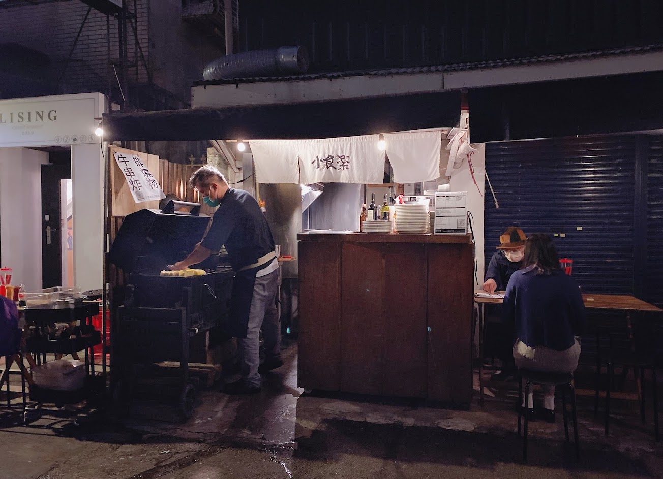 地點位於忠孝新生6號出口步行1分鐘,週末生意很好建議要訂位,低消500元/人,露天座位很有街頭感。