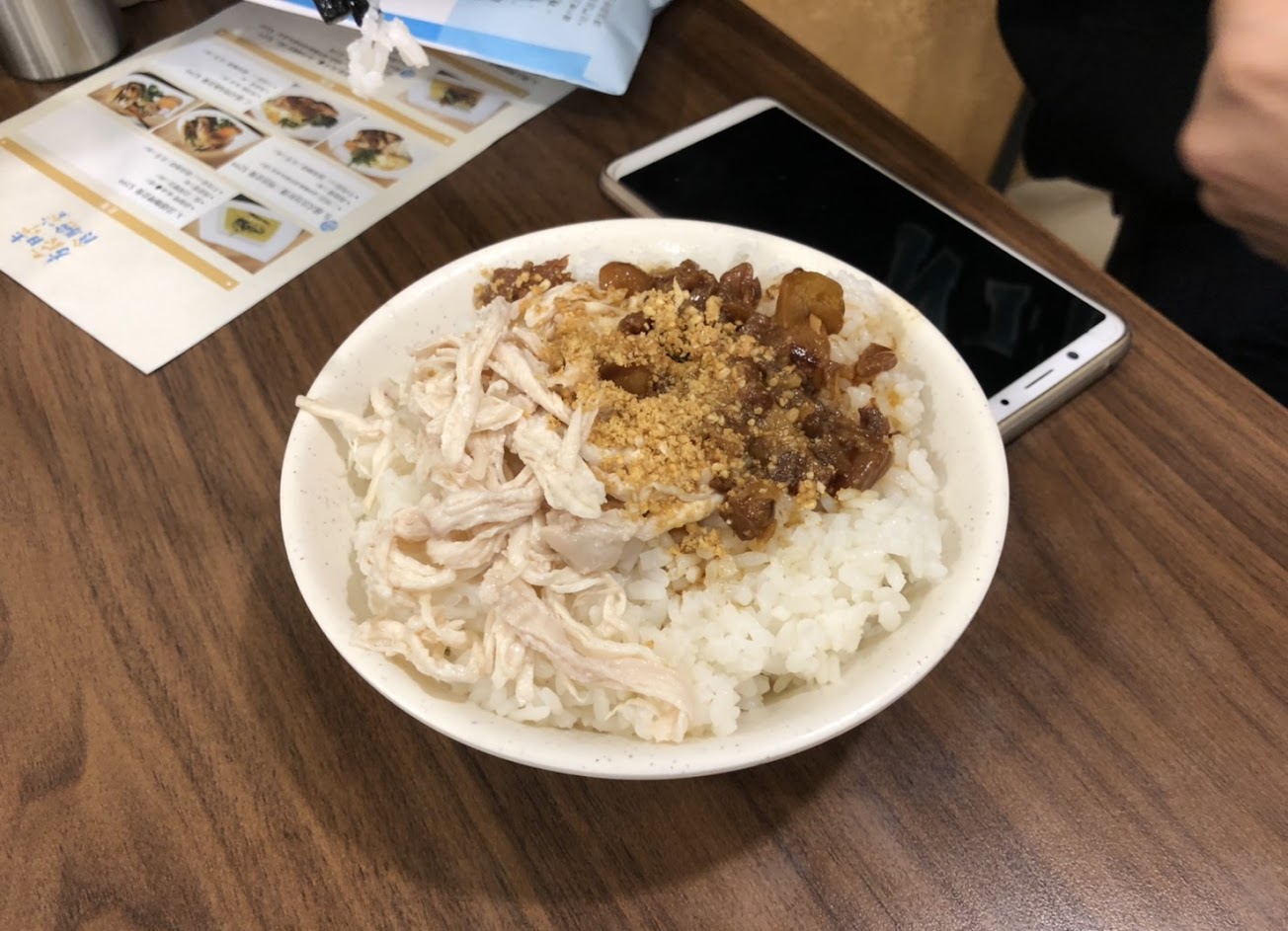 點了一個雞滷飯,上面灑花生粉,完全不搭他的口味就算了,整個飯唏唏爛爛的,台灣最普遍小吃,在怎麼差頂多油一點或鹹一點,這個真的超難吃,配上完全不知道什麼的雞肉絲,吃完都不知道吃什麼。 小菜呢,小黃瓜普通沒記憶點有的酸,有的沒味道,亂醃一通。連安全的嘴邊肉,到底冰多久!?吃下去像沒味道的肉乾,再搭配不知名的油膏,這到底是什麼組合啊!崩潰! 吃完已經很賭爛了,跟老闆娘說買單,他說等一下,我當然站著看電視等她,奇怪,沒嘴巴是不是,不知何時他一直看著我,突然老闆娘像空安一樣手奇怪的姿勢擺著,原來是示意要我付錢,還得把錢塞到他指縫,我一直無法脫離那個情境!我臉應該很疆,更扯是他把錢丟在托盤上還給我沾到湯汁,我個人覺得我很有休養,拿錢擦了抹布轉身就走。