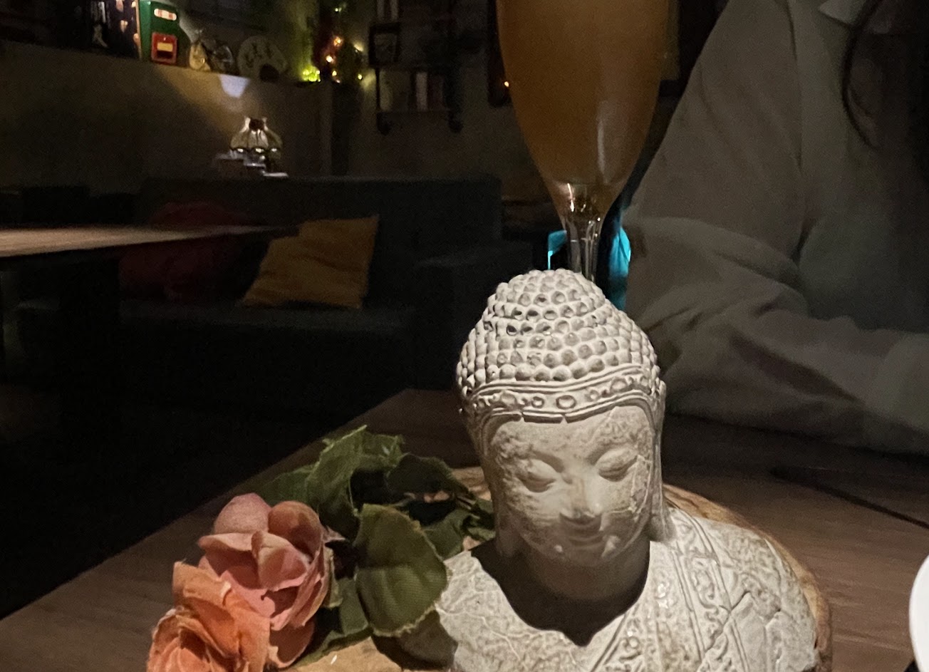 ? 春夏秋冬又一春 ??$380 琴酒/文山包種茶/薰衣草/白酒/杏仁/葡萄柚 用石雕佛祖來訴說關於輪迴的故事 修行、頓悟、救贖 包種茶清香淡雅 包覆著讓人放鬆的薰衣草香氣 杏仁味濃厚 葡萄柚增添微酸的滋味 就像人生般複雜 卻又值得細細品味的一杯調酒