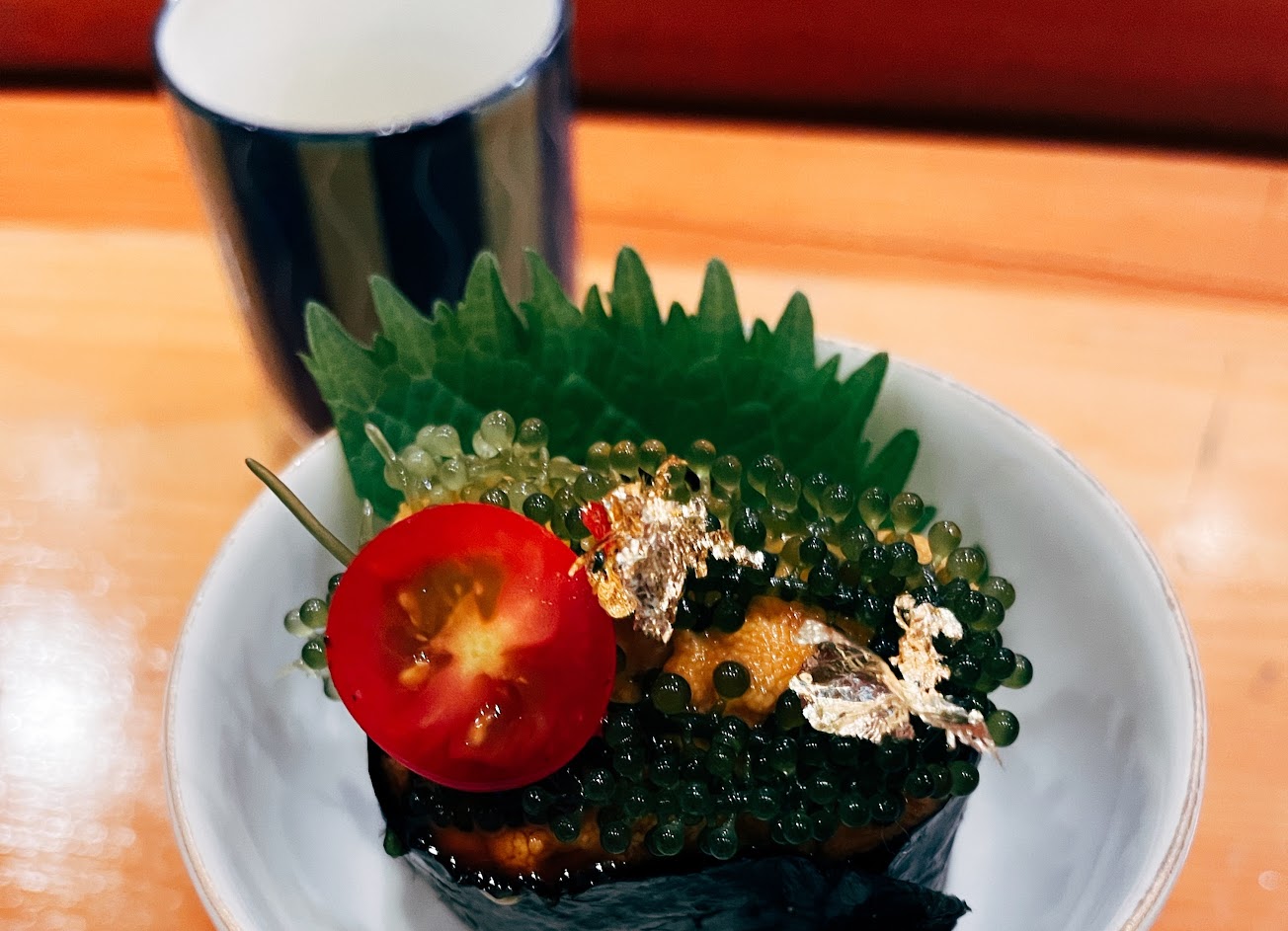 紫蘇花又是不同味道、軍艦中海膽的奶香搭海葡萄和紫蘇花口感有層次、生魚片搭蔥超解膩!
