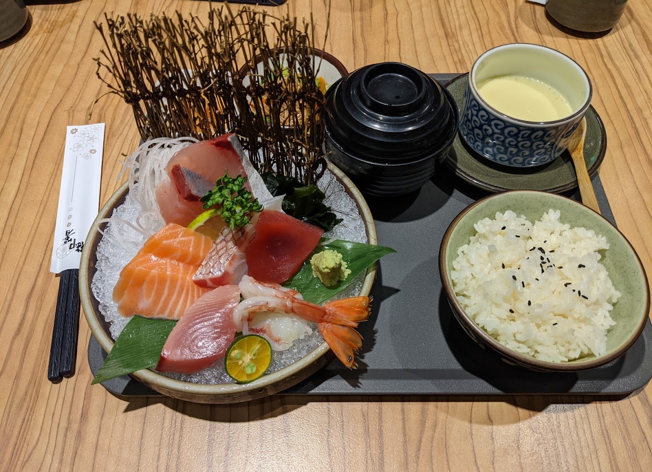 點的生魚片定食,厚薄剛好,芥末也好吃 竟然有兩片鮭魚跟一個蝦子太棒啦 海鮮湯可以無限續,續杯的部分也會呈料給你喔,喝了兩碗,有吃到不同的魚片、蛤蜊、蝦頭、蘿蔔 涼拌的青菜和金針菇爽口,另一碟小菜是薑 白飯粒粒分明,這種餐廳的白飯都好吃 可惜蒸蛋就只有蛋本人,好像沒吃到其他料