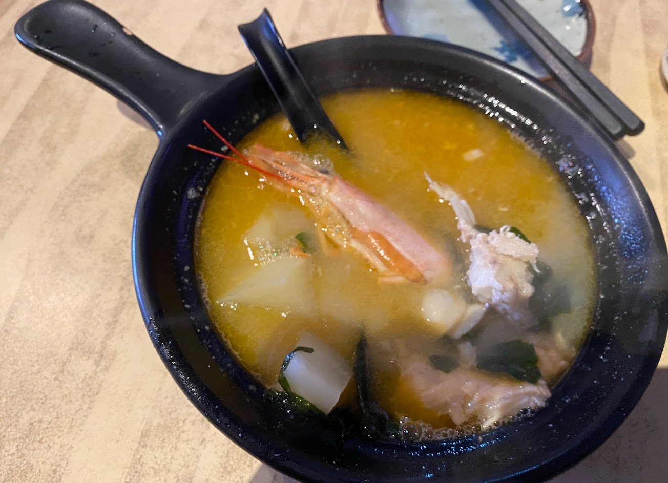 味噌湯是另外讓我有點驚喜的點,額外加入蝦頭跟蘿蔔熬製。整碗有豐富的蝦味,喜歡吃蝦膏的人會特別喜愛這碗湯。