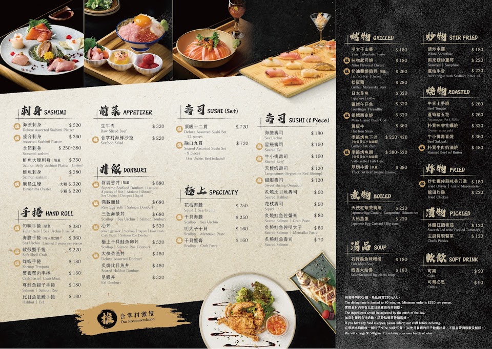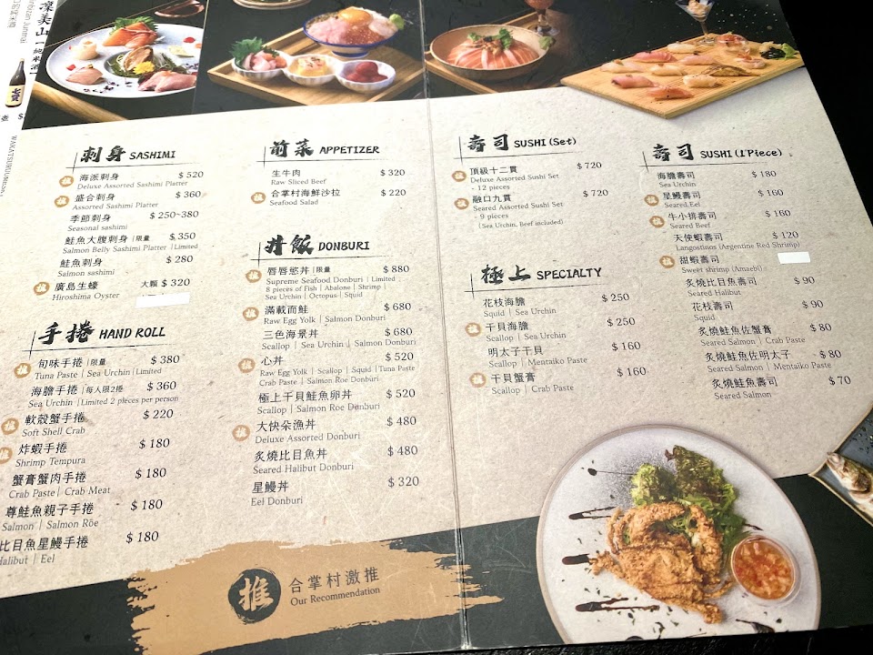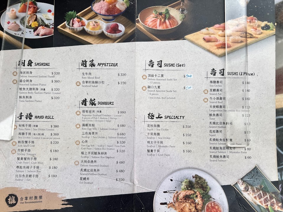 合掌村海鮮沙拉 生牛肉沙拉 九貫握壽司 綜合刺身