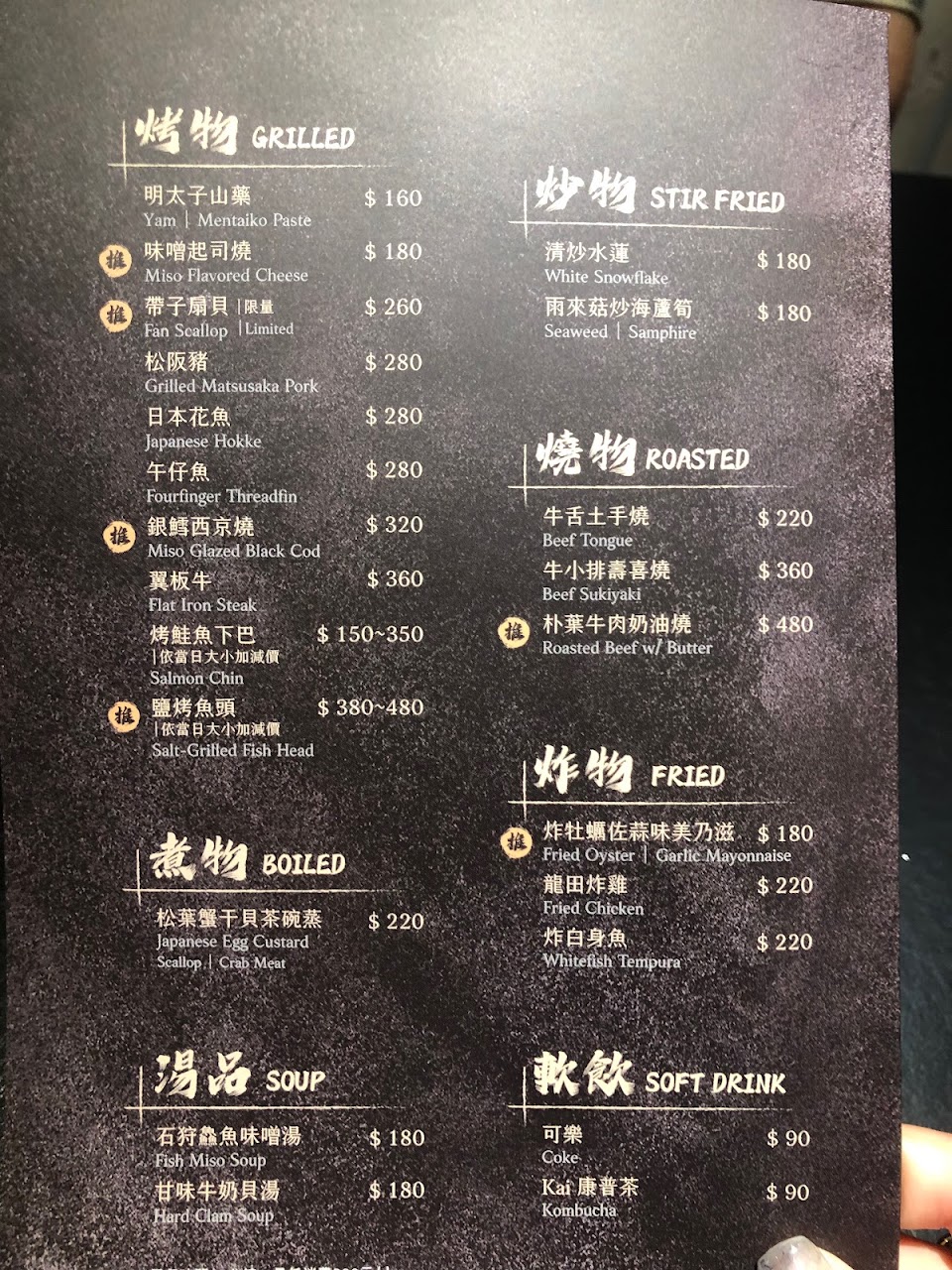 好友聚會本來計畫點無菜單料理的,但因為大家中午不想吃太多最後只隨意點幾道,單點的菜色也都非常新鮮好吃,熱情的店家還跟我們互動有獎徵答,最後一人答對贈送我們一桌四人份擺盤精美的超大顆炸牡蠣太驚豔了,沒想到連贈送的菜色都這麼用心感謝店家招待?