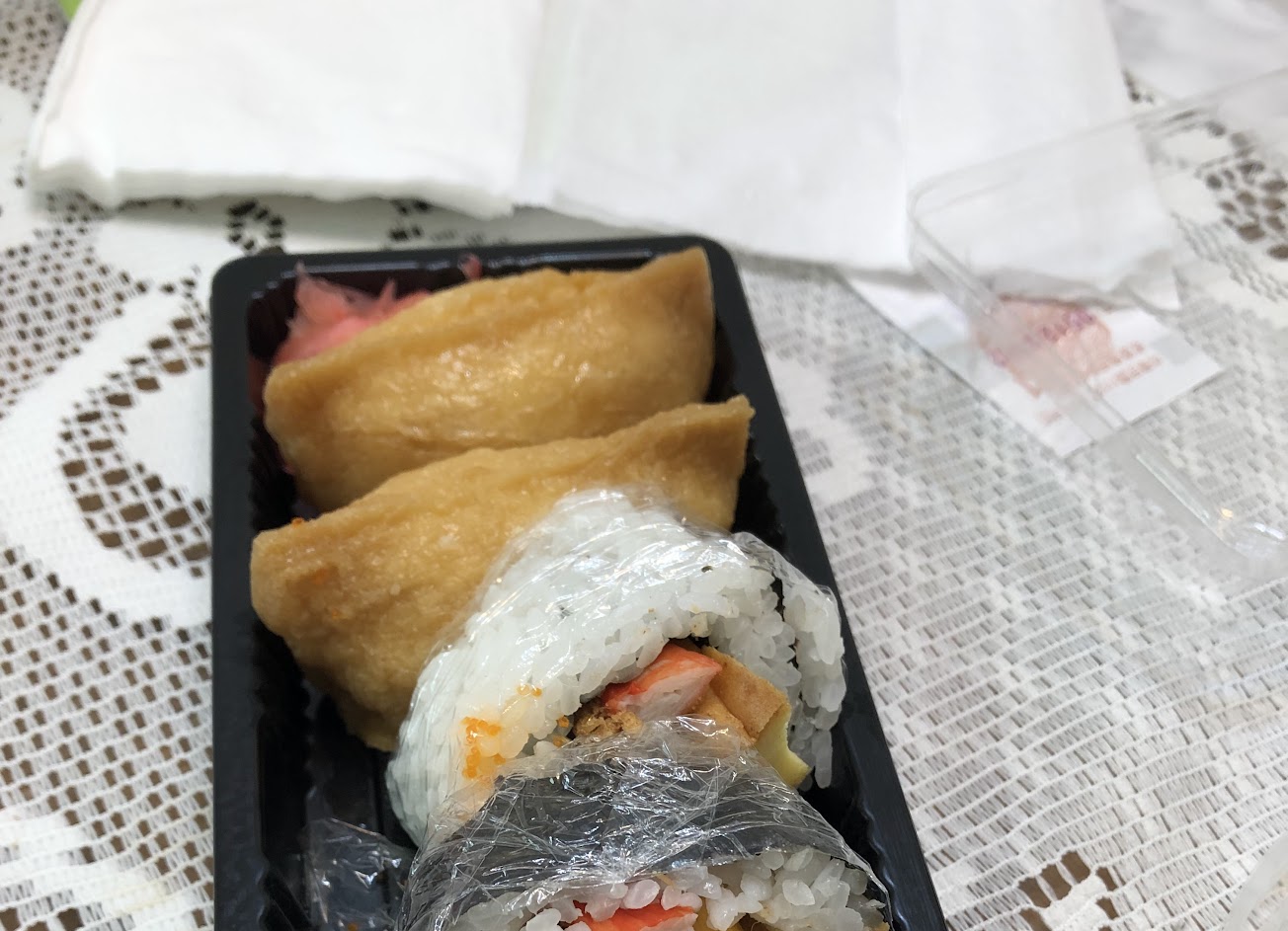 外帶區有壽司、便當等選項,壽司除了稻荷、花壽司,還有加州卷,味道平實,預期中的味道,醋飯不會過酸,裡頭的蛋好像不是傳統捲壽司裡面的玉子,有點輕乳酪蛋糕口感