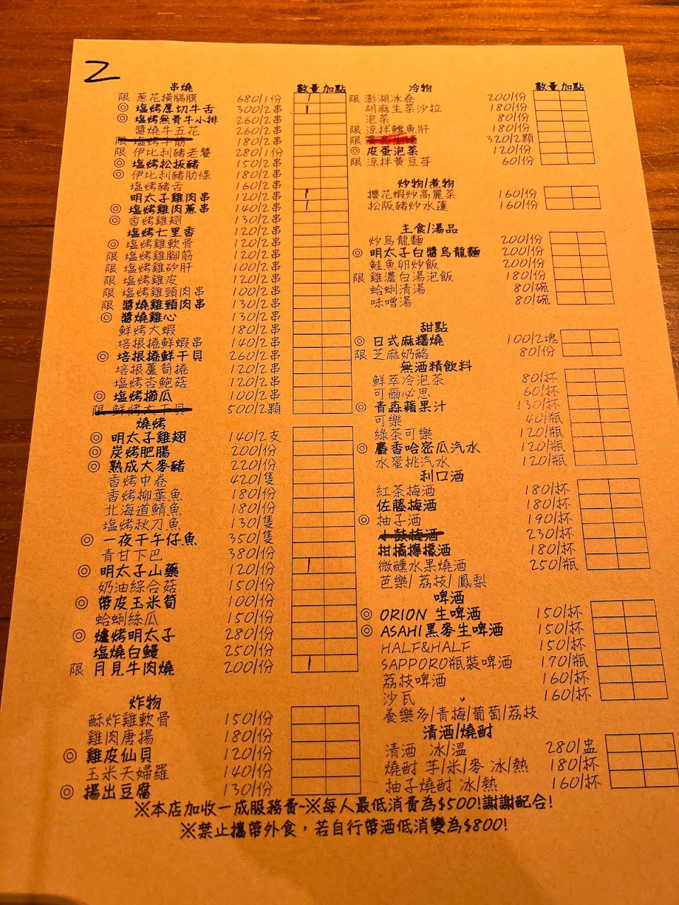 價錢不合理,東西不算好吃但偏貴,一人1500至2000 只是吃雞串喝喝啤酒,不知道以為是無餐牌……..