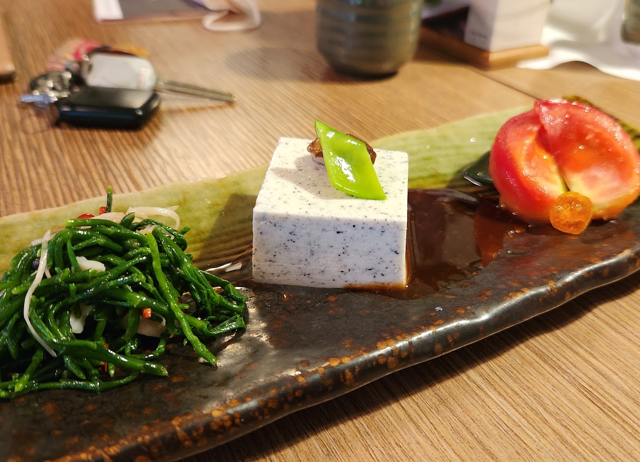 在一棟1931年由足立仁教授興建的洋和式建築吃晚餐。選了雅宴(1380元):1. 梅露香凍,微酸順口。2. 冷香六品(時令食材隨季節變更),內含鮑魚、洋蔥海帶絲、洋蔥海葡萄、黃金泡菜、鯖魚嫩、醃蘿蔔、南瓜,一旁點綴的紫色小花是紫蘇花,吃起來很清爽很喜歡。3. 刺身五品,內含鮭魚、鮪魚、旗魚、蝦子、干貝,每一個都新鮮美味,擺盤也美。4. 松露灼蝦南瓜蒸蛋,蒸蛋吃起來超南瓜,意外和松露很搭。5. 蘋果醋飲正常發揮。6. 鍋煎安格斯牛排5分熟,佐玉米苗、炸牛蒡片、蘆筍、小番茄,牛排偏硬還不錯,但海鮮完勝。7. 煸菇栗子蒸飯,看起來超普通,但意外很好吃的一碗飯。8. 海魚蛤蜊味噌湯,喝起來不錯但就是正常發揮。9. 旬常甜食-水信玄餅,很不甜,一樣紫蘇花很加分。