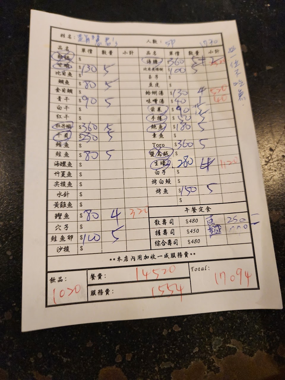 游壽司 金華店的Omakase 今天我們一個人大概NTD 3500,看你總共吃多少決定最後結帳金額。