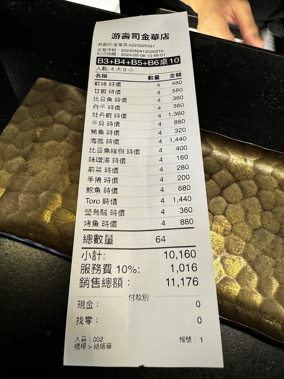 我先生很喜歡壽司,到台灣都要找好吃的壽司餐廳,我們第一次試游壽司金華店,帶著孩子我跟孩子點了綜合,因為是第一次,想吃吃看綜合是甚麼樣子的綜合,沒想到點了之後,聽見兩位廚師在切台後面嘲笑我們點綜合,一附我們是很笨的外行人,感覺真的很不好,我們會帶著先生繼續品嘗台北的壽司店,但是不會再來這家師傅看不起人的店了,也不會推薦朋友來。