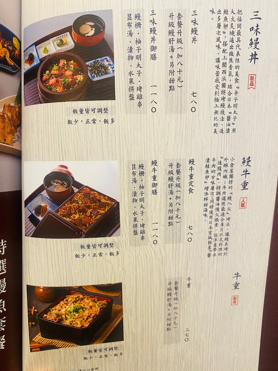 鰻重定食,也都可升級鰻肝湯,升級甜點,