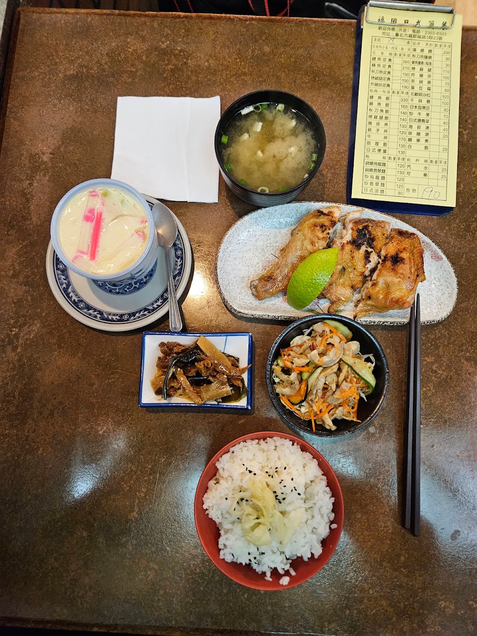 定食包含漬物、小菜(干貝唇沙拉)、茶碗蒸、味噌湯