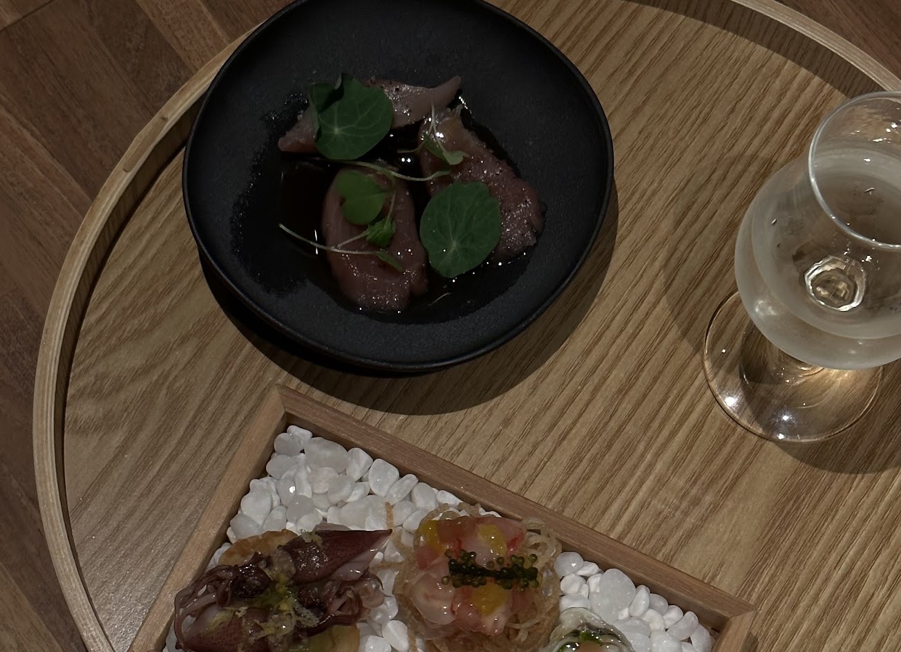 其中最喜歡的餐點是一個綠咖哩搭炸牛舌的,平常我其實是不太愛綠咖喱的味道(因為很重的椰奶味),但搭配上旁邊的蔬菜,還有一個很香的香菜苗,整體吃起來的口感層次很豐富,綠咖喱跟牛舌的味道搭配的很合宜,因為有綠蔬菜的點綴也不會過膩。再來第二個喜歡的是那個開胃小塔(甜蝦的),甜蝦吃起來很新鮮,上面有海葡萄的搭配所以吃起來有鮮甜的海味,但我覺得瑩烏賊的吃起來還好,沒有像甜蝦那麼驚艷。