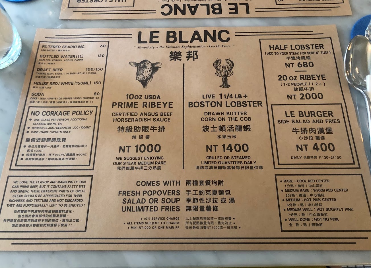 餐牌十分簡單,其實不用看餐牌,窩夫已經知道要點甚麼,分別是特級肋眼牛排套餐(新台幣1,000元/約港幣250元)和波士頓活龍蝦套餐(新台幣1,400元/約港幣350元)。