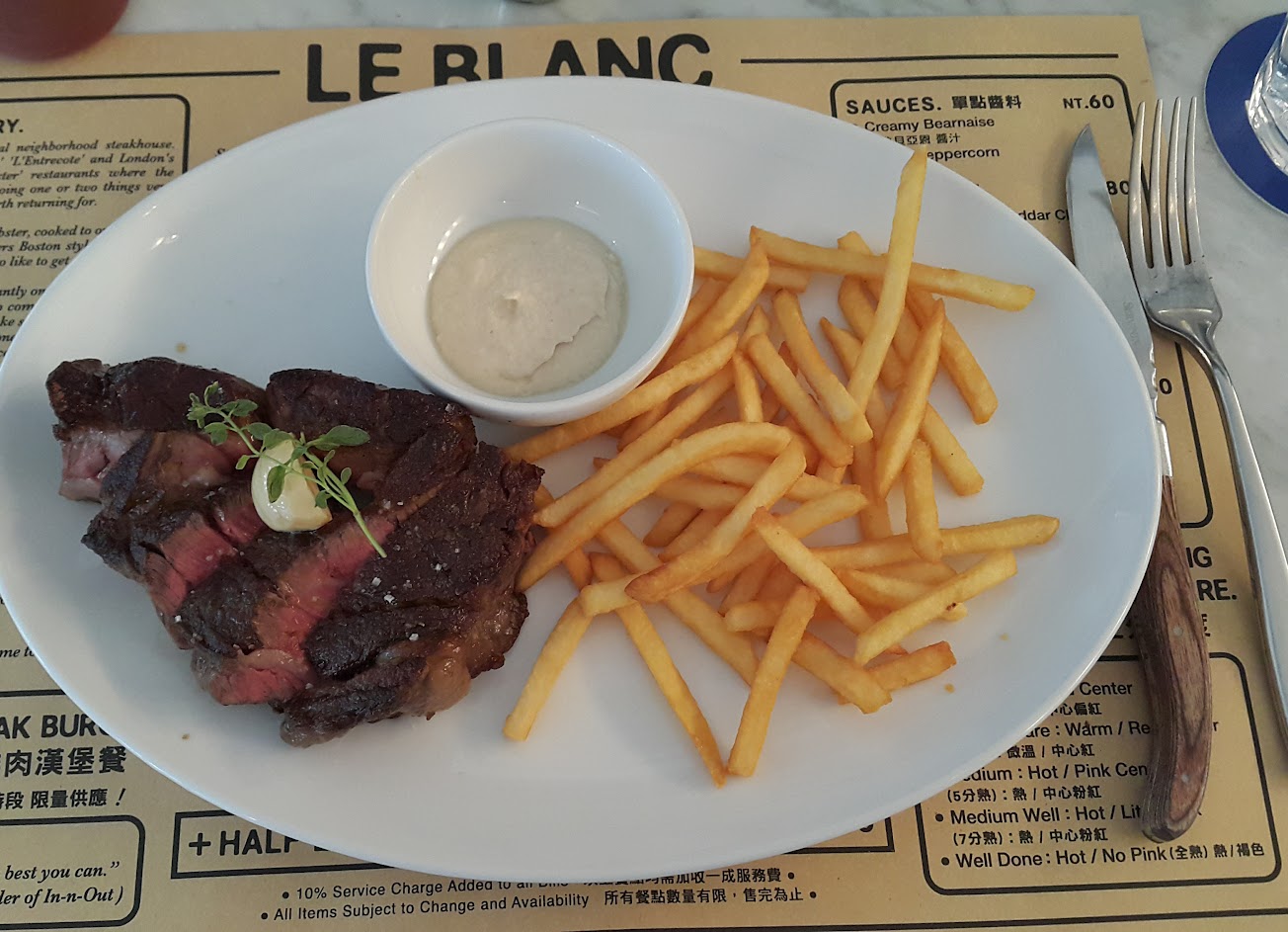 Le blanc的肋眼牛排真的很推薦,也是份量非常足,每次吃都很滿意,三分熟剛剛好,部分有筋有油脂,口感層次多~雖然有時候吃到牛筋還是有點膩口;薯條可以無限續但附餐有麵包湯,吃完10oz牛排就超飽;用餐環境很舒服!