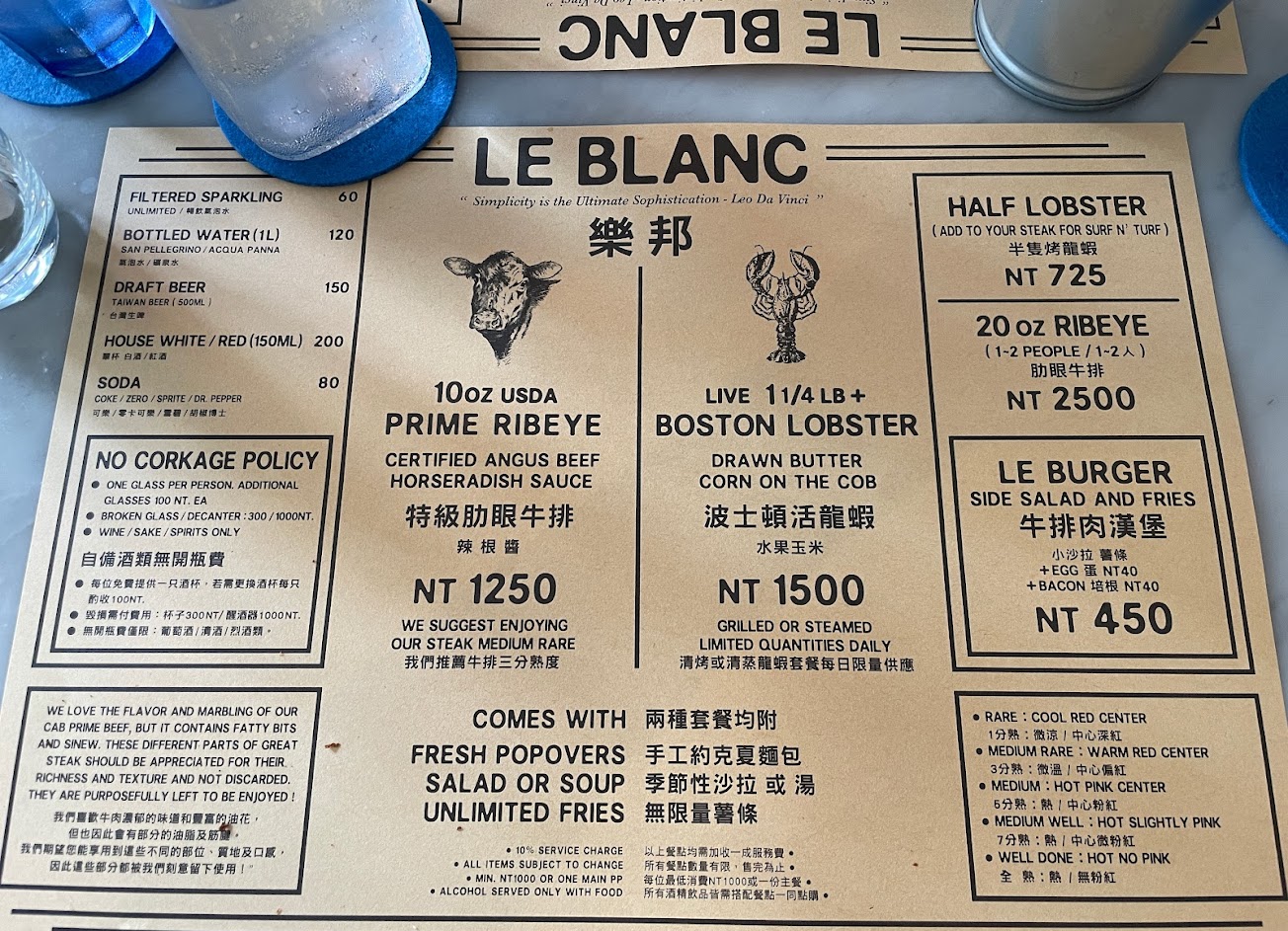 米其林餐廳就是有底氣,整個菜單就只有三種主餐:肋眼牛排、活龍蝦、牛排肉漢堡。我點了牛排,朋友點了活龍蝦。