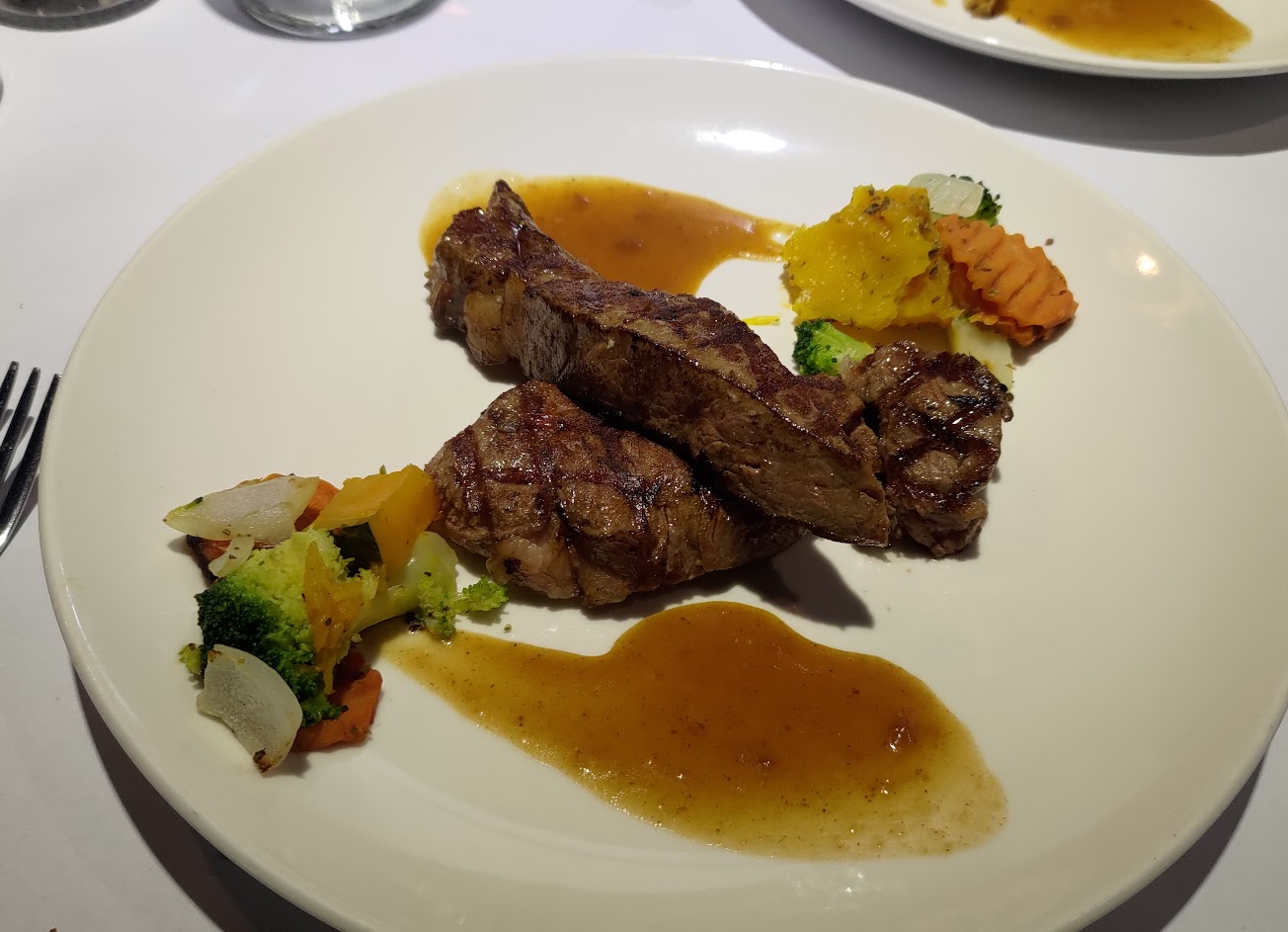 聖誕節只有聖誕套餐可以選,點了美國安格斯肋眼牛排和海鮮套餐,各加一隻龍蝦,前菜鴨胸非常好吃,牛肉湯有點油但很香,主菜牛肉給的醬是我討厭的蕈菇,只能把醬勉強撥開但還是有味道?