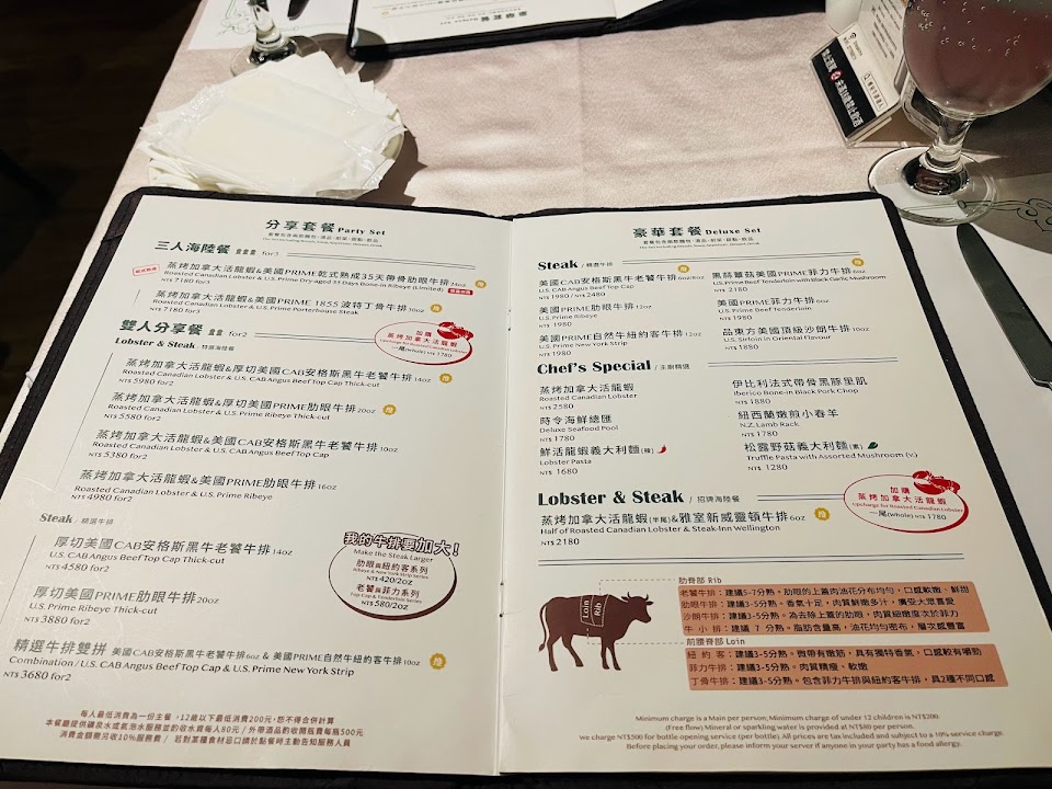 點了安格斯黑牛老饗牛排跟龍蝦,牛排照服務生推薦點了五分熟非常好吃,肉質軟嫩且不需特別加調味料就很好吃了,龍蝦也非常好吃,湯及前菜的部分推薦點酥皮濃湯及焗烤田螺