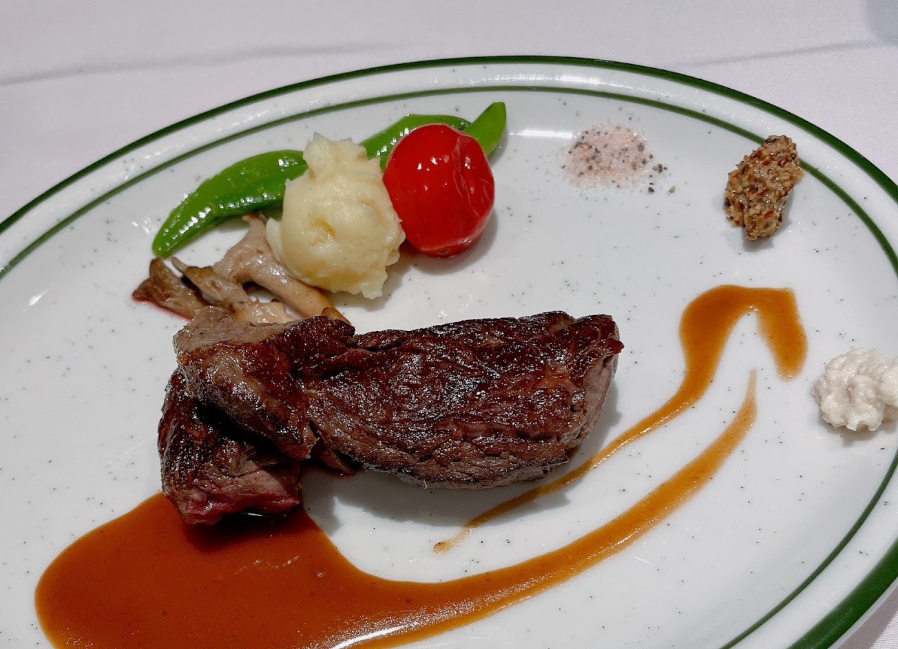 主餐部分是3分熟的雅室牛排,牛排的表現非常出色,3分熟的熟度,入口卻完全沒有原本擔心的咬不爛情形,反而香氣濃郁表皮酥脆,吃的出雅室的水準!