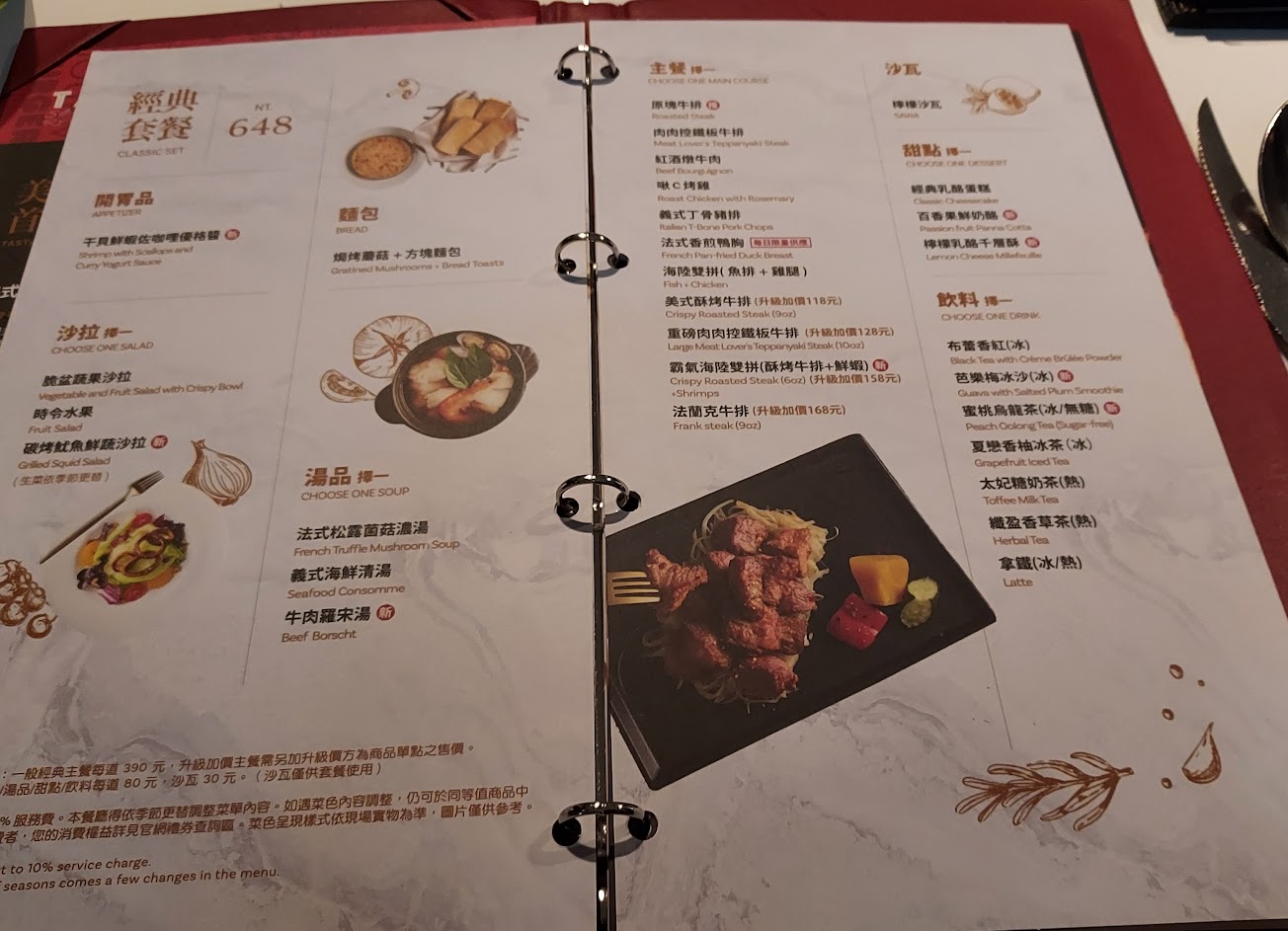 先講菜色的部分,開胃品的干貝鮮蝦佐咖哩優格醬是冷盤,口感蠻特別還算新鮮好吃?沙拉的時令水果也是正常表現,但是碳烤魷魚鮮蔬沙拉的味道就很奇怪,魷魚的味道不是很好?後來有位漂亮的德瑋服務人員態度很好的就詢問要不要換另外一道沙拉,這裡感受就很好,主動詢問顧客的需求也提出可以幫忙替換,非常感謝?麵包加上焗烤蘑菇是經典的菜色,真的很好吃而且味道都沒有改變,麵包也可以續點,湯品的松露菌菇濃湯、義式海鮮清湯表現都還可以?主餐的原塊牛排與香煎鴨胸真的是很推薦,很好吃?但是另外加價點的法蘭克牛排又是一個讓人匪夷所思的口感,沒有什麼牛肉的味道,而之前的服務人員也還是過來關心問要不要換一道,但就想說也吃了就沒有再麻煩他幫我們換一道,這個主餐就不推薦了……甜點的經典乳酪蛋糕推薦可以點,檸檬乳酪千層酥就普通,飲料的熱纖盈香草茶蠻有香氣可以解膩,太妃糖奶茶比較甜膩,芭樂莓冰沙就像在喝梅子粉冰沙的感覺,另外點的松露薯條也沒有什麼松露味道,油炸的油膩感蠻重。